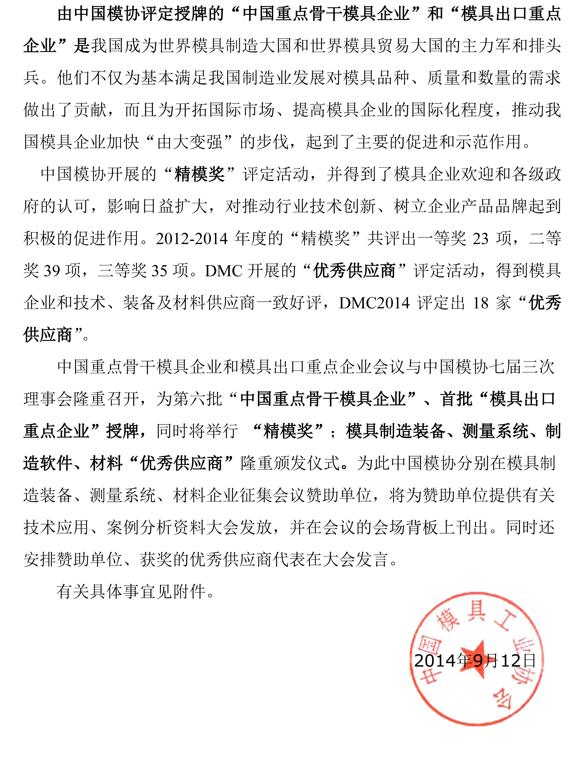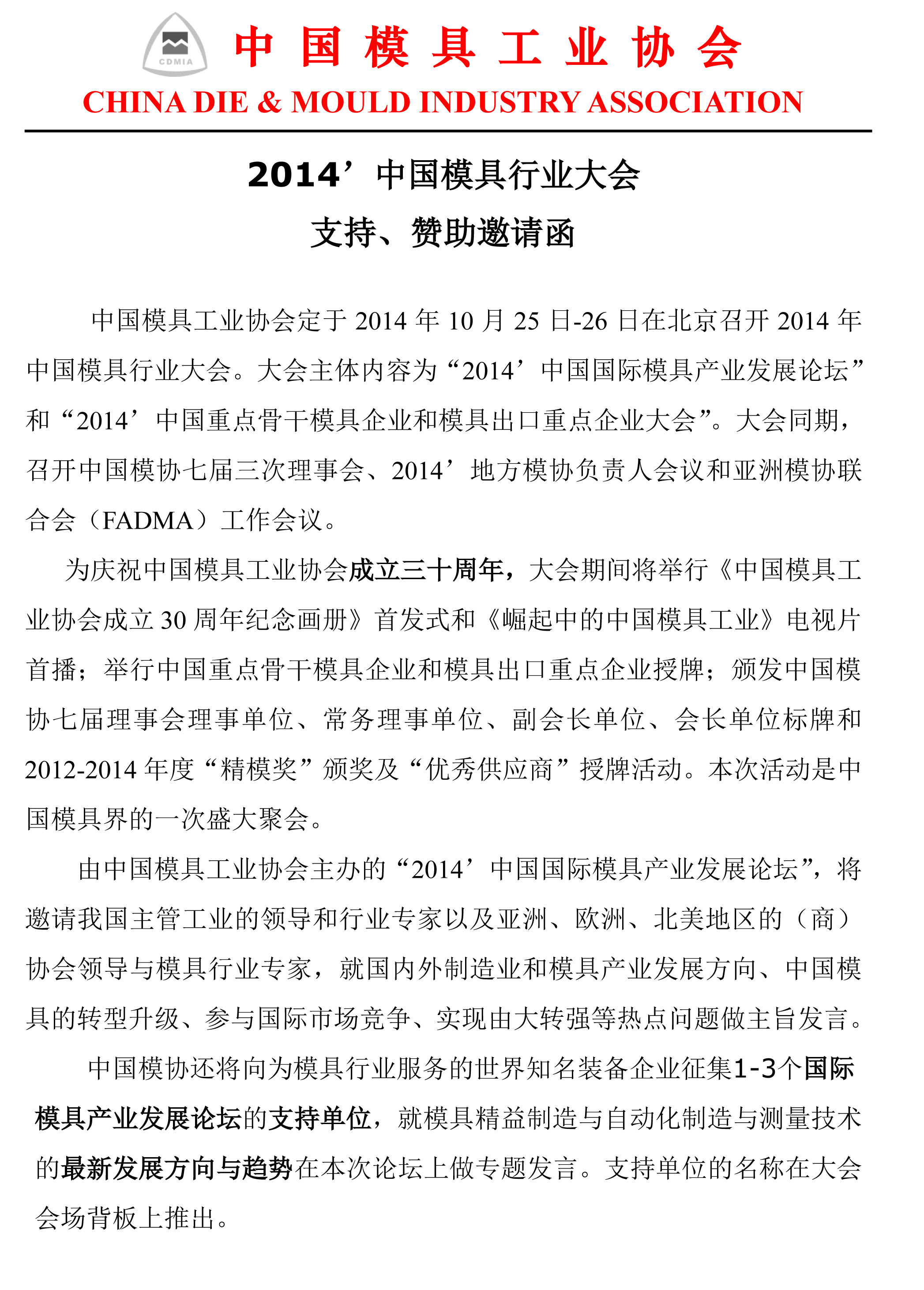 2014’中國模具行業(yè)大會(huì )支持、贊助邀請函
