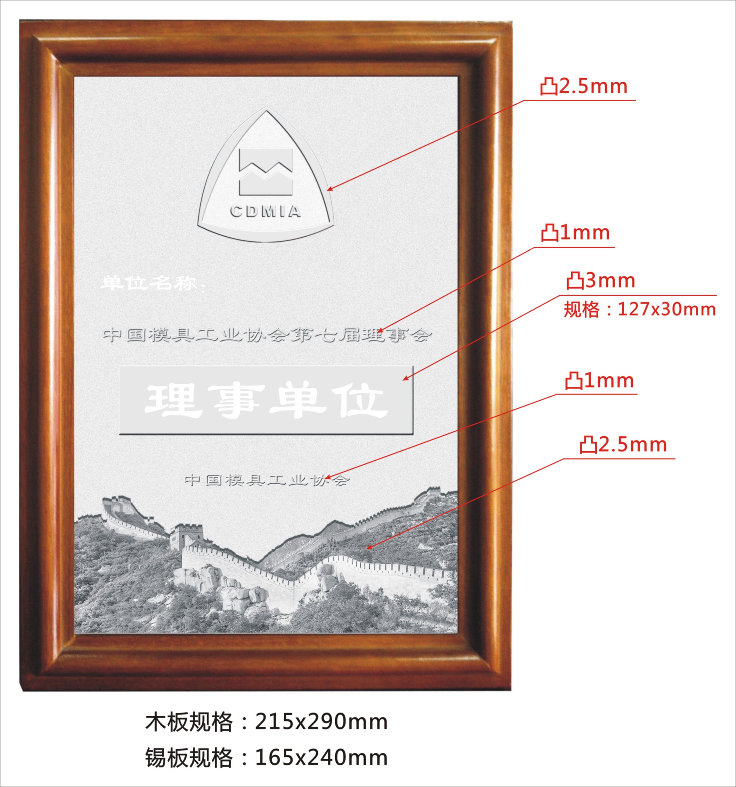 中國模具工業(yè)協(xié)會(huì )第七屆理事會(huì )換屆后,為規范協(xié)會(huì )的管理,增強理事、常務(wù)理事、會(huì )長(cháng)、副會(huì )長(cháng)的責任感、榮譽(yù)感。我們?yōu)檫x為理事、常務(wù)理事、會(huì )長(cháng)、副會(huì )長(cháng)頒發(fā)了任職證書(shū)。同時(shí)決定為理事單位、常務(wù)理事單位、會(huì )長(cháng)單位、副會(huì )長(cháng)單位制作標牌??紤]到換屆后理事、常務(wù)理事的增補和調整,標牌制作作了適當延遲?,F在標牌已完成設計制作方案(見(jiàn)標牌式樣效果圖,標牌材質(zhì)采用錫版模具壓制,單位名稱(chēng)和職務(wù)名稱(chēng)由北京精雕科技集團有限公司雕刻并開(kāi)始制作),準備在今年10月北京召開(kāi)的七屆第三次理事會(huì )上頒發(fā)。由于制作工作量大、時(shí)間緊,將視各單位交納會(huì )費情況優(yōu)先制作發(fā)放。希望還沒(méi)有按規定交納會(huì )費的單位盡快辦理交納會(huì )費。并及時(shí)與中國模協(xié)聯(lián)系。