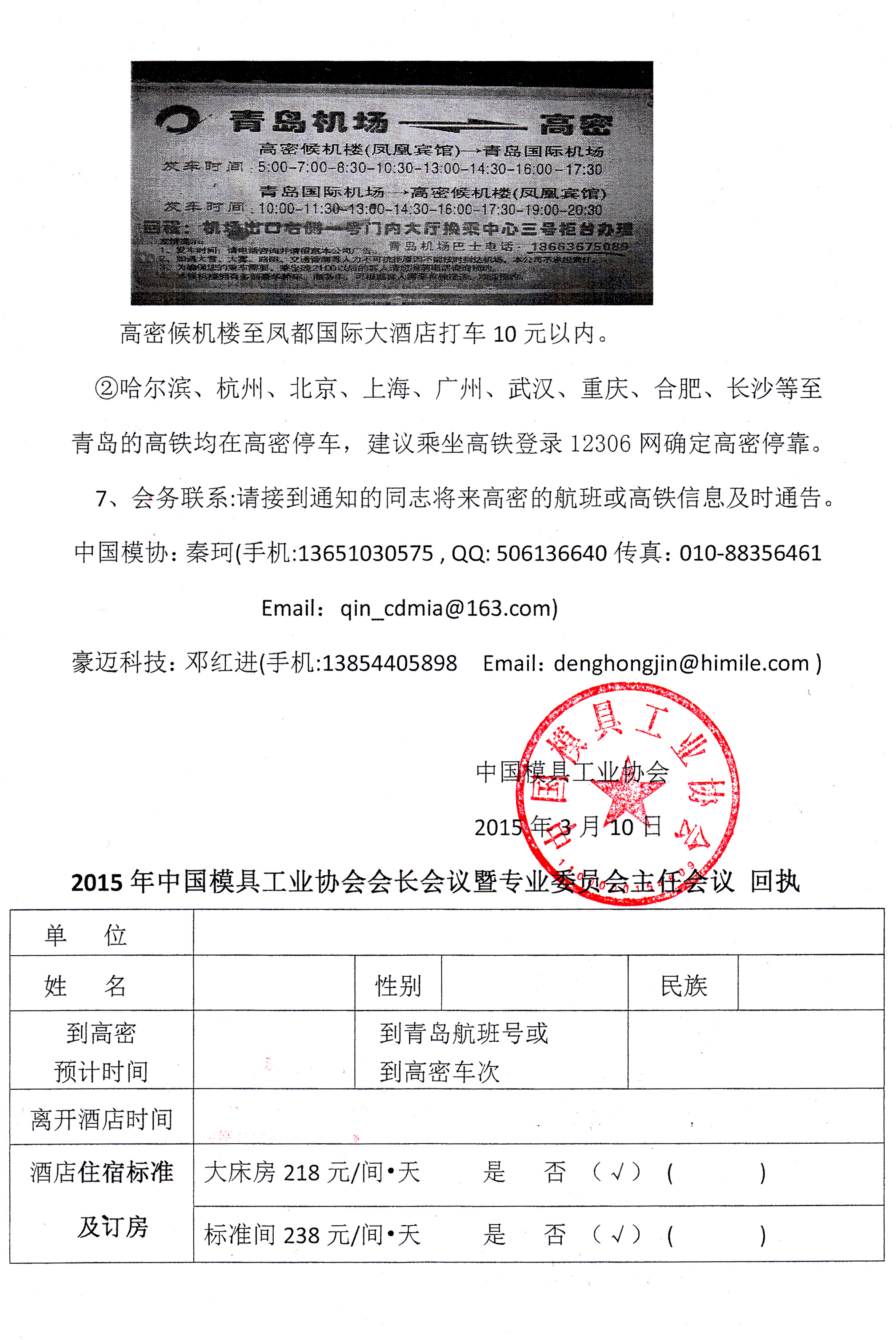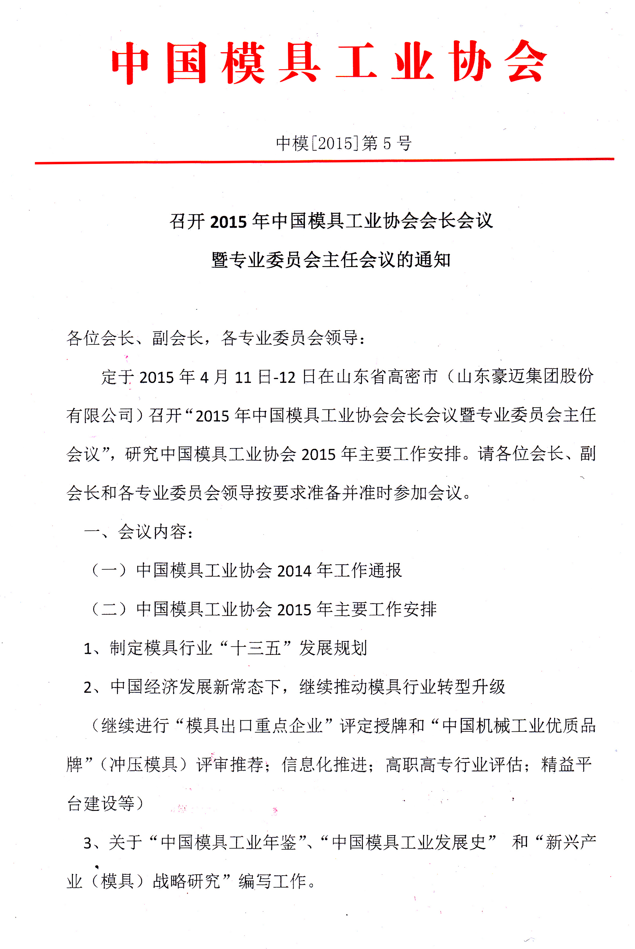 召開(kāi)2015年中國模具工業(yè)協(xié)會(huì )會(huì )長(cháng)會(huì )議暨專(zhuān)業(yè)委員會(huì )主任會(huì )議的通知