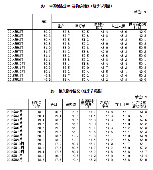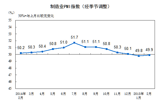 2015年2月,中國制造業(yè)采購經(jīng)理指數(PMI)為49.9%,比上月微升0.1個(gè)百分點(diǎn),表明制造業(yè)收縮幅度收窄。