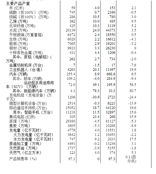 分產(chǎn)品看,3月份,588種產(chǎn)品中有412種產(chǎn)品同比增長(cháng)。其中,鋼材9923萬(wàn)噸,同比增長(cháng)3.3%;水泥20139萬(wàn)噸,增長(cháng) 24.0%;十種有色金屬431萬(wàn)噸,增長(cháng)4.4%;乙烯162萬(wàn)噸,增長(cháng)10.0%;汽車(chē)255.4萬(wàn)輛,增長(cháng)8.9%;轎車(chē)109.2萬(wàn)輛,下降4.0%;發(fā)電量4779億千瓦時(shí),增長(cháng)4.0%;原油加工量4491萬(wàn)噸,下降0.2%。