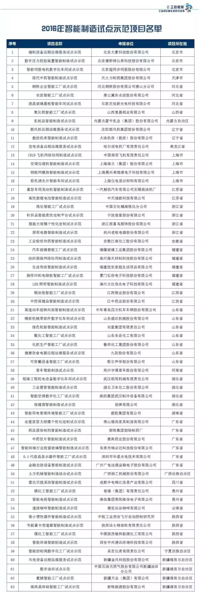關(guān)于公布2016年智能制造試點(diǎn)示范項目名單的通告