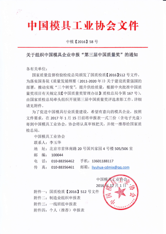 關(guān)于組織中國模具企業(yè)申報“第三屆中國質(zhì)量獎”的通知