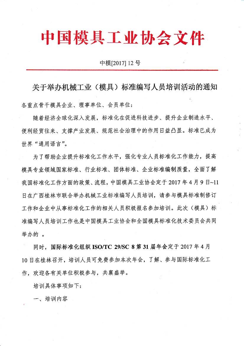 關(guān)于舉辦機械工業(yè)(模具)標準編寫(xiě)人員培訓活動(dòng)的通知