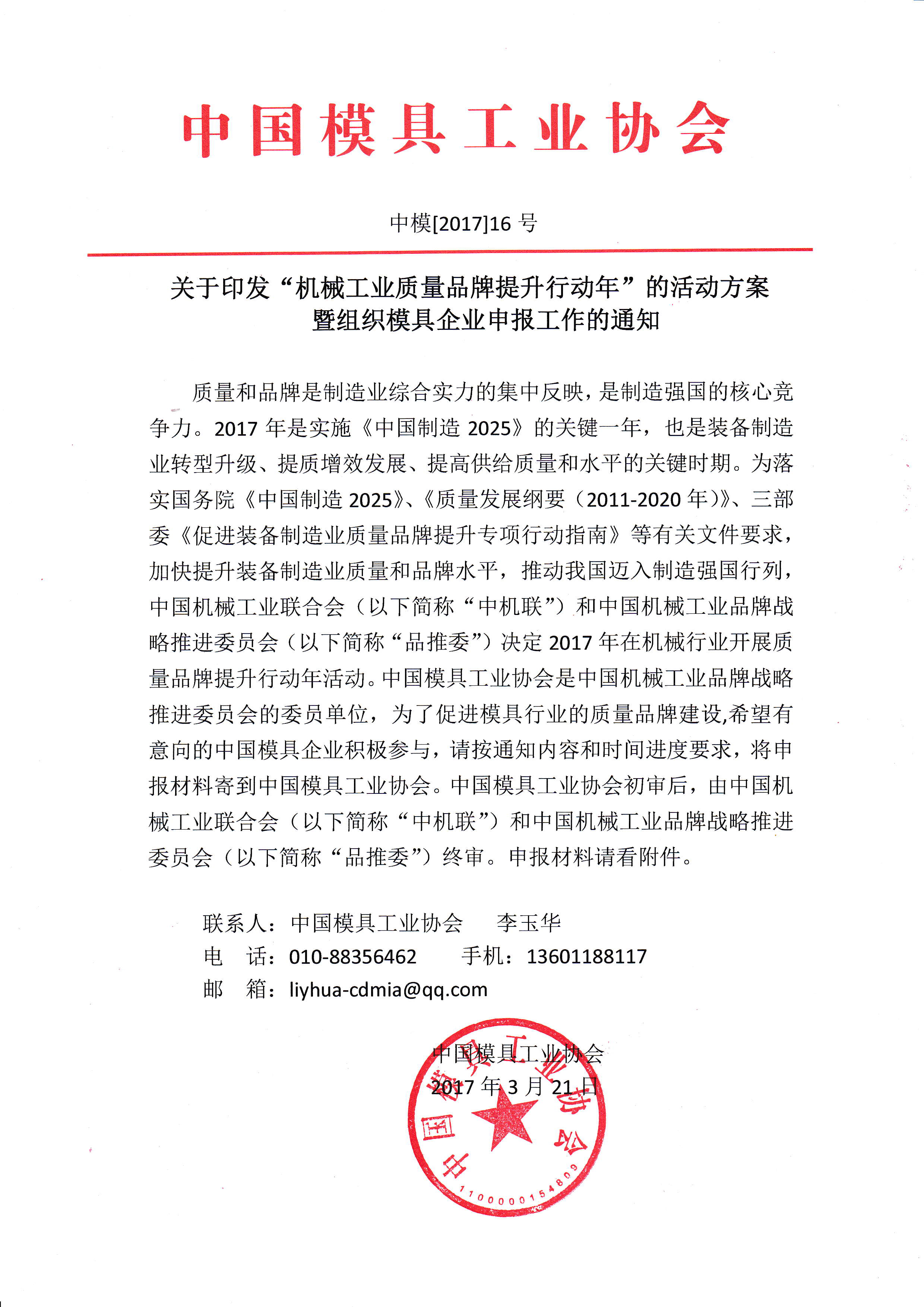關(guān)于印發(fā)“機械工業(yè)質(zhì)量品牌提升行動(dòng)年”的活動(dòng)方案暨組織模具企業(yè)申報工作的通知