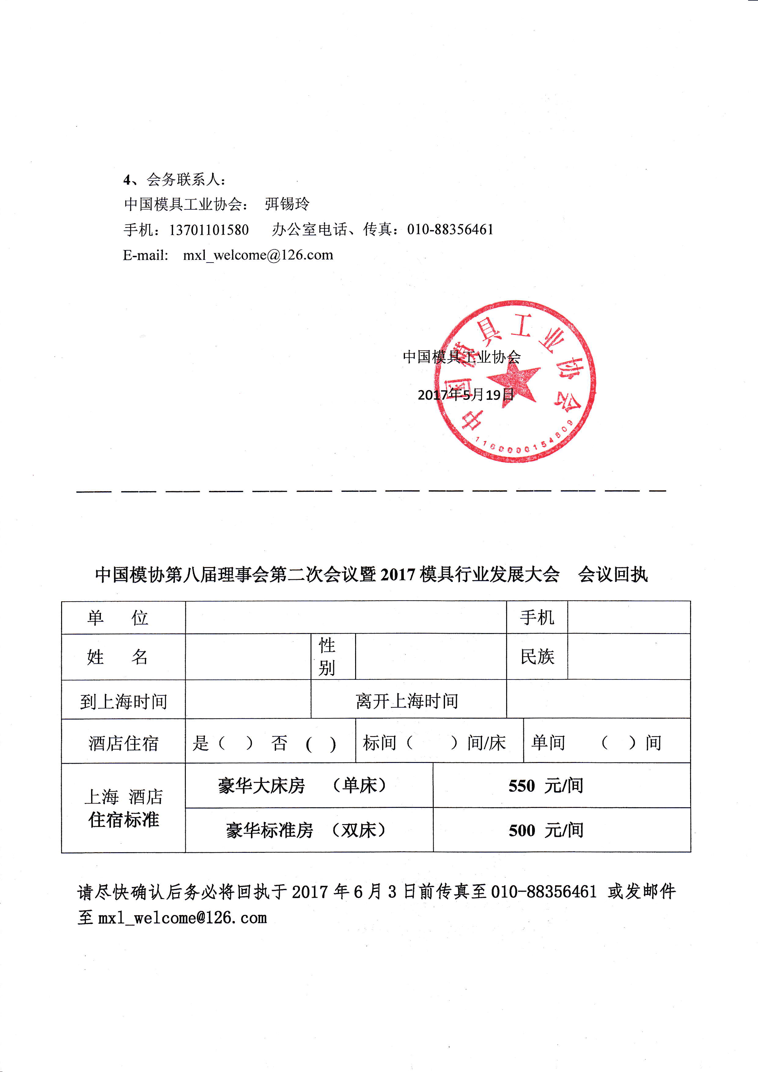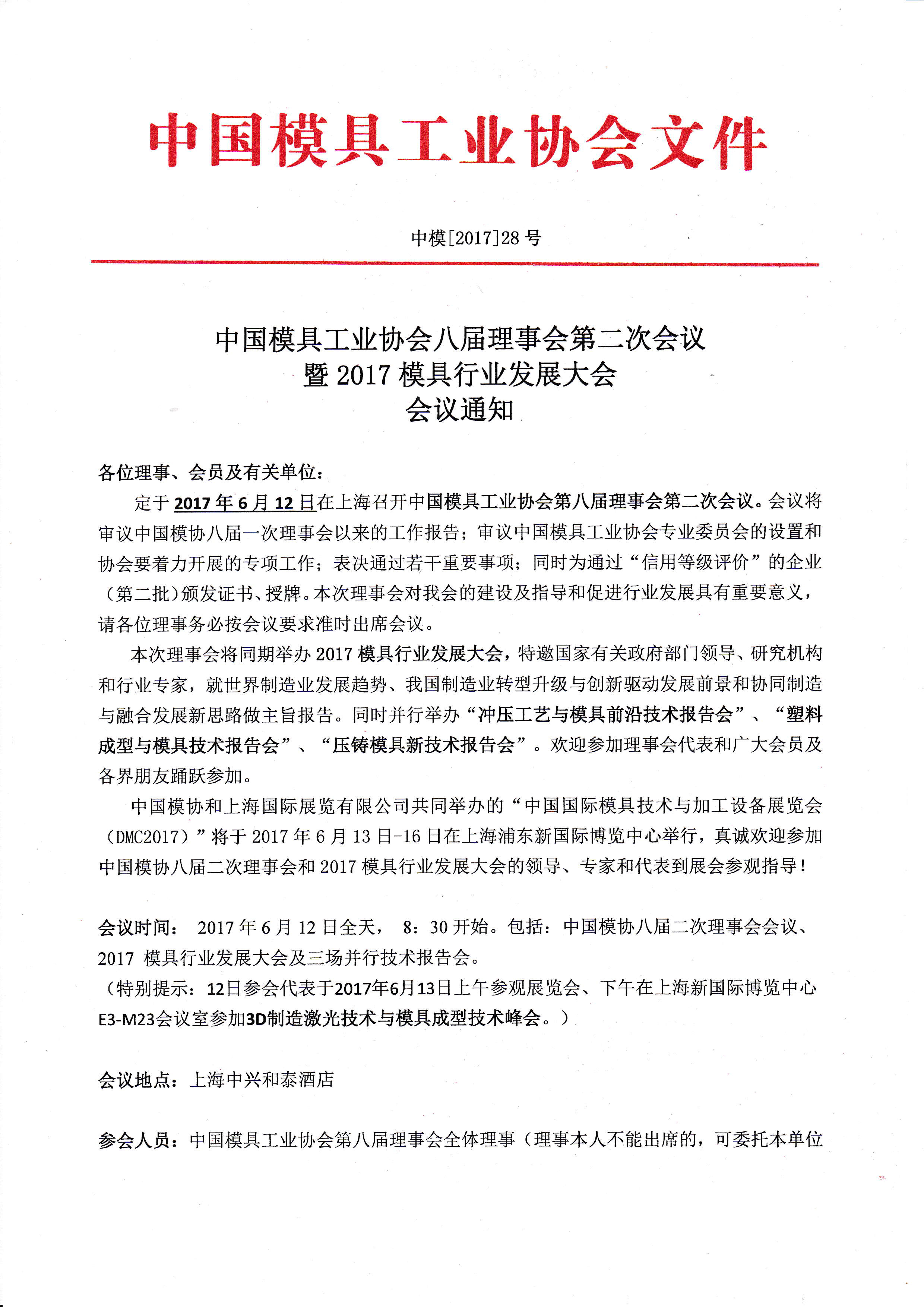 中國模具工業(yè)協(xié)會(huì )八屆理事會(huì )第二次會(huì )議暨2017模具行業(yè)發(fā)展大會(huì )會(huì )議通知
