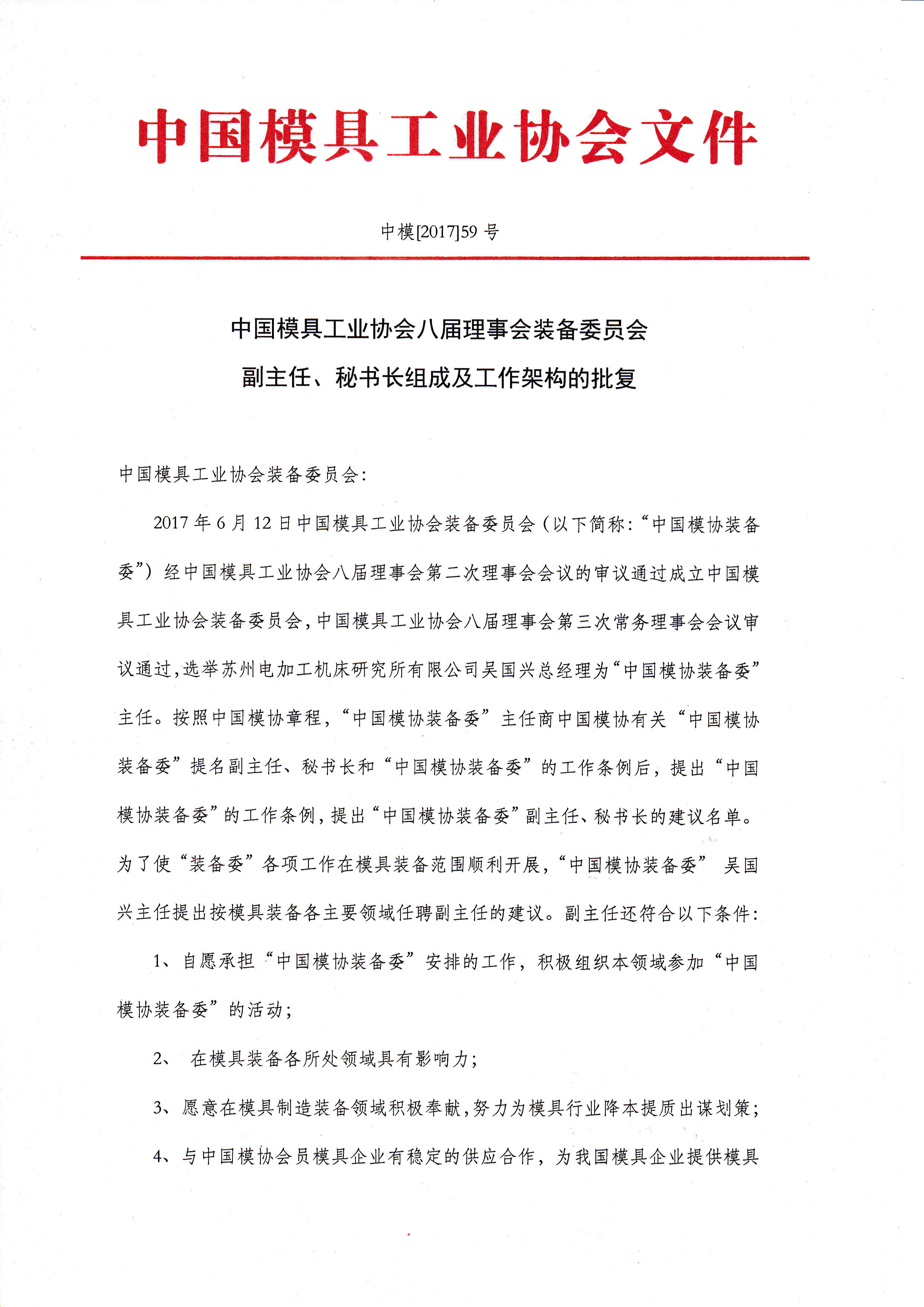 中國模具工業(yè)協(xié)會(huì )裝備委員會(huì )副主任、秘書(shū)長(cháng)組成及工作架構的批復