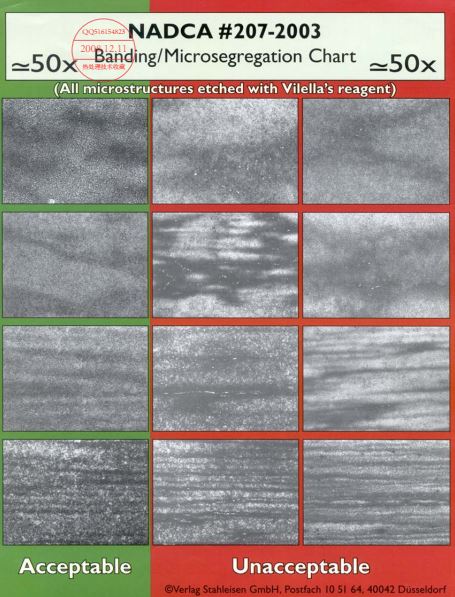 NADCA 207#-2003標準中進(jìn)行了修訂,劃分依據是偏析帶中是否存在可見(jiàn)的大顆粒一次碳化物,存在即判為不合格,并且不再區分不同鋼種的帶狀組織。如下圖: