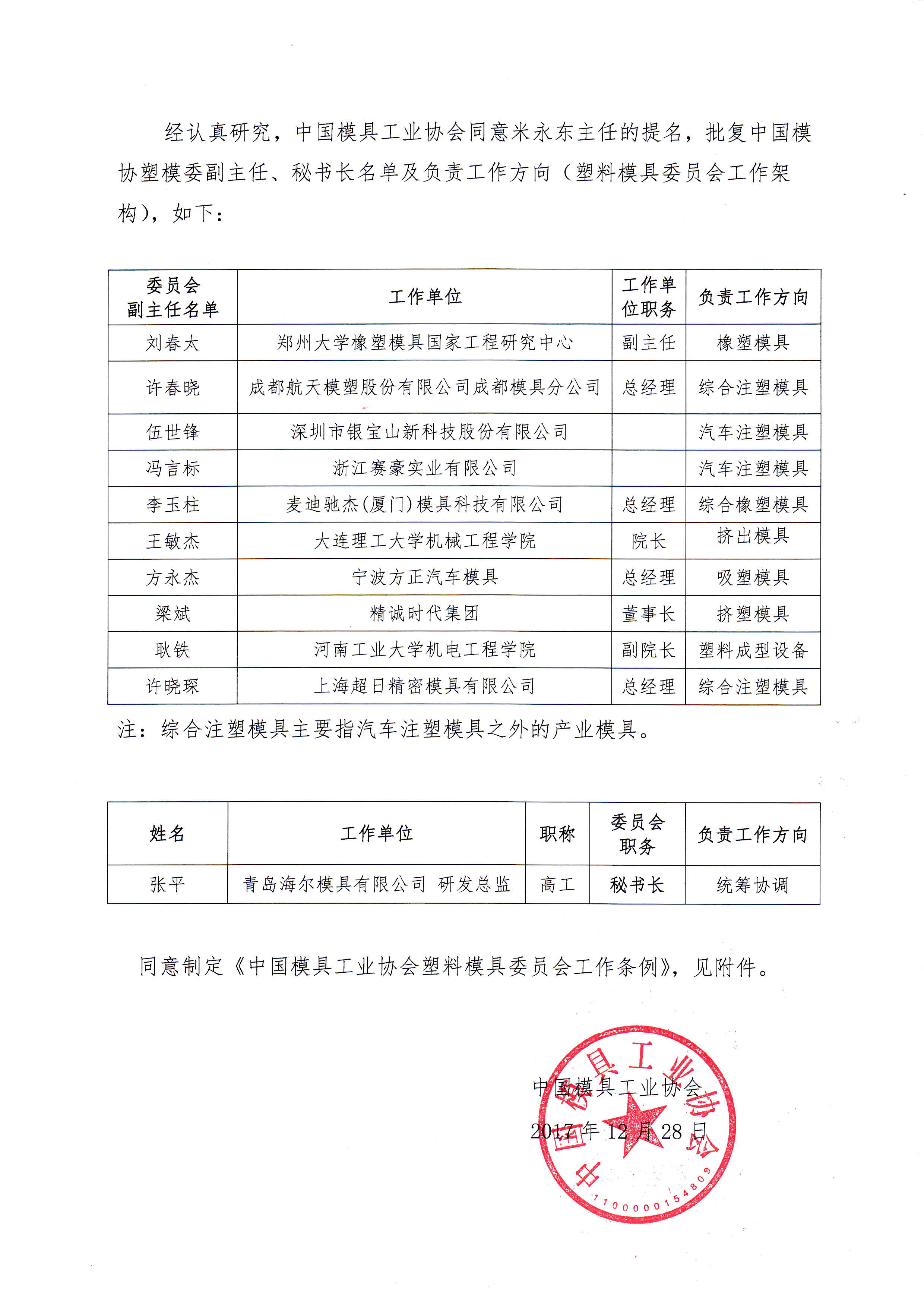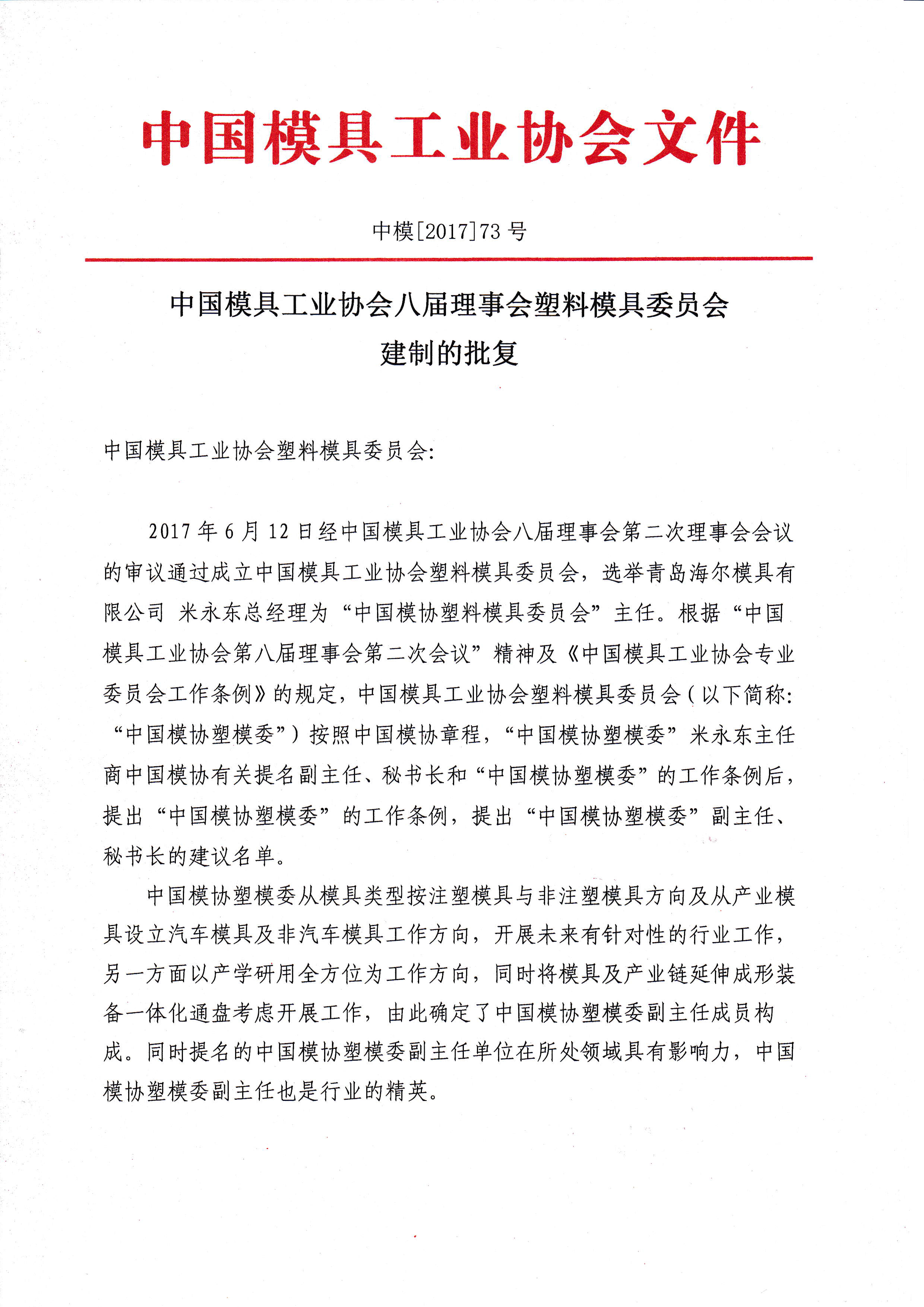中國模具工業(yè)協(xié)會(huì )八屆理事會(huì )塑料模具委員會(huì )建制的批復