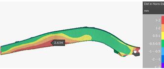 (2)根據零件的特點(diǎn)和前期CAE分析得出的回彈結果,制定合理的回彈補償方案,并運用CAE反向回彈補償技術(shù)對模具型面進(jìn)行補償,補償后CAE驗證回彈均在要求的+-0.5mm之內,有效的解決高強度鋼板回彈大的問(wèn)題;