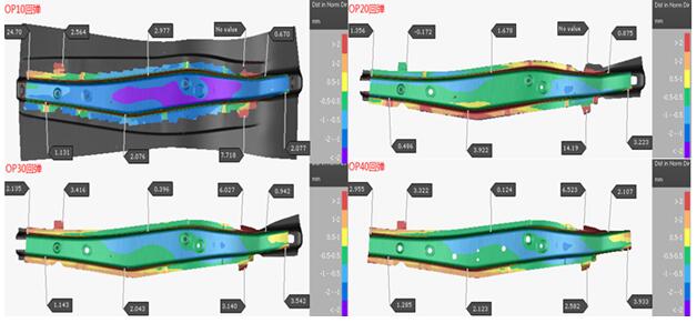 零件的全工序分析通過(guò)后,對零件進(jìn)行回彈分析。首先對零件進(jìn)行自由回彈分析來(lái)判斷零件的回彈趨勢,零件從第一工序到第四工序的回彈結果如圖7所示。由圖可知,零件各工序的回彈趨勢比較一致;在OP10拉延成形后,零件有幾個(gè)局部區域的回彈較大,主要集中在零件的兩端和側壁位置;經(jīng)過(guò)OP20切邊之后由于應力釋放使側壁的回彈值有所上升,其它位置的回彈變化不大;零件在OP30整形后側壁的回彈值有減少趨勢,但兩端的回彈值增加,特別是零件前端的法蘭部分;零件在OP40進(jìn)行局部的切邊和沖孔,該工序屬于零件的應力釋放過(guò)程,回彈值變化不大。