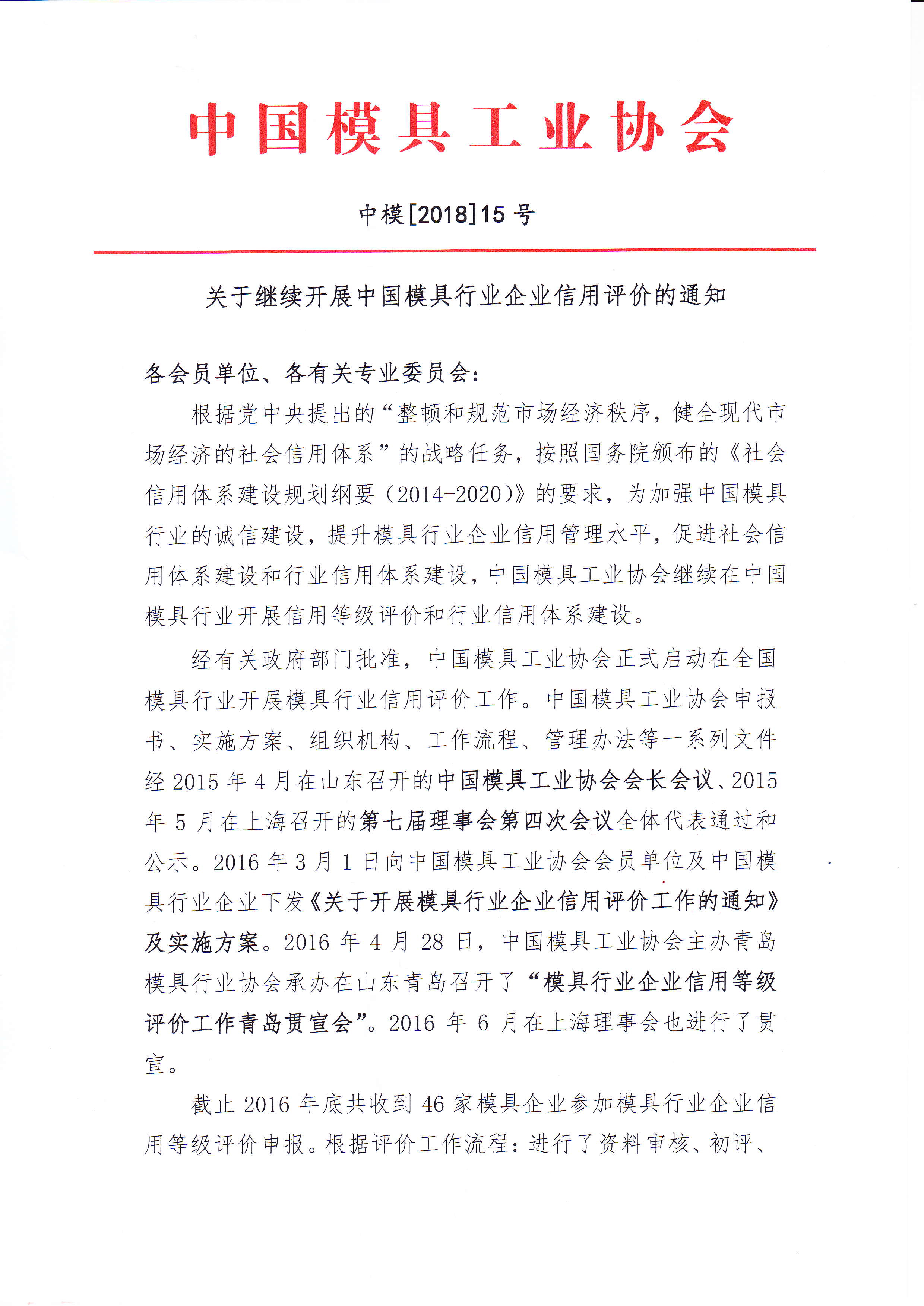 關(guān)于繼續開(kāi)展中國模具行業(yè)企業(yè)信用評價(jià)的通知