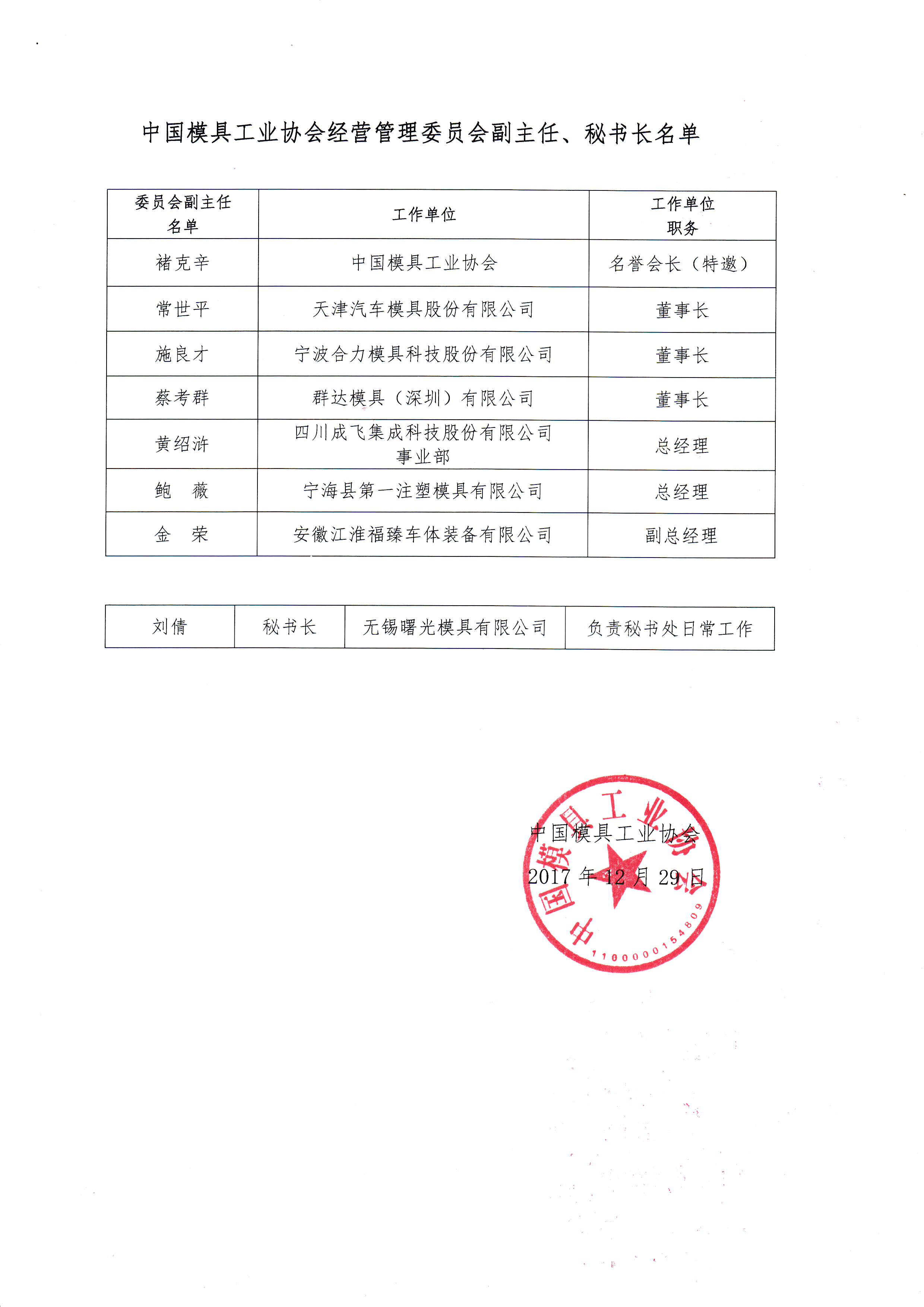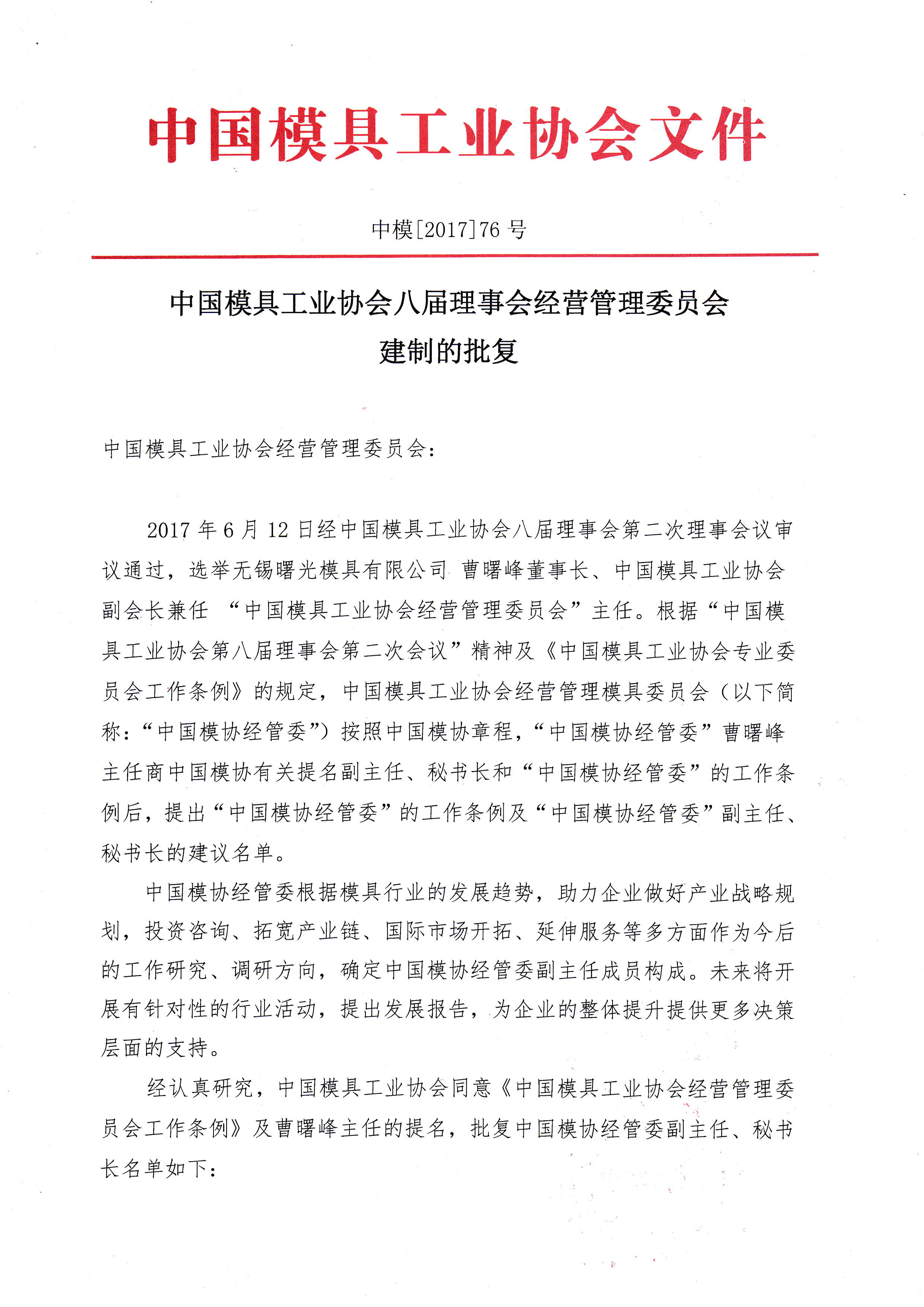 中國模具工業(yè)協(xié)會(huì )八屆理事會(huì )經(jīng)營(yíng)管理委員會(huì )建制的批復