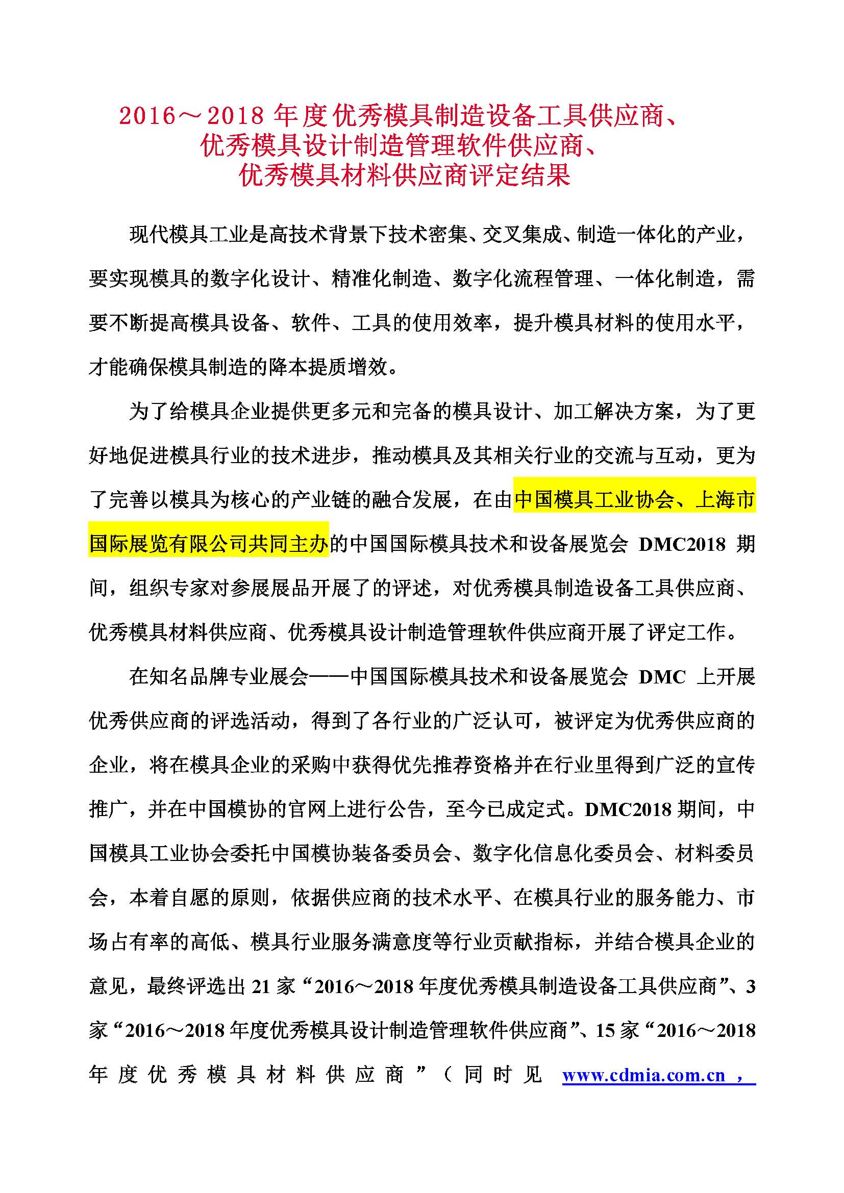 2016~2018年度優(yōu)秀模具制造設備工具供應商、 優(yōu)秀模具設計制造管理軟件供應商、 優(yōu)秀模具材料供應商評定結果