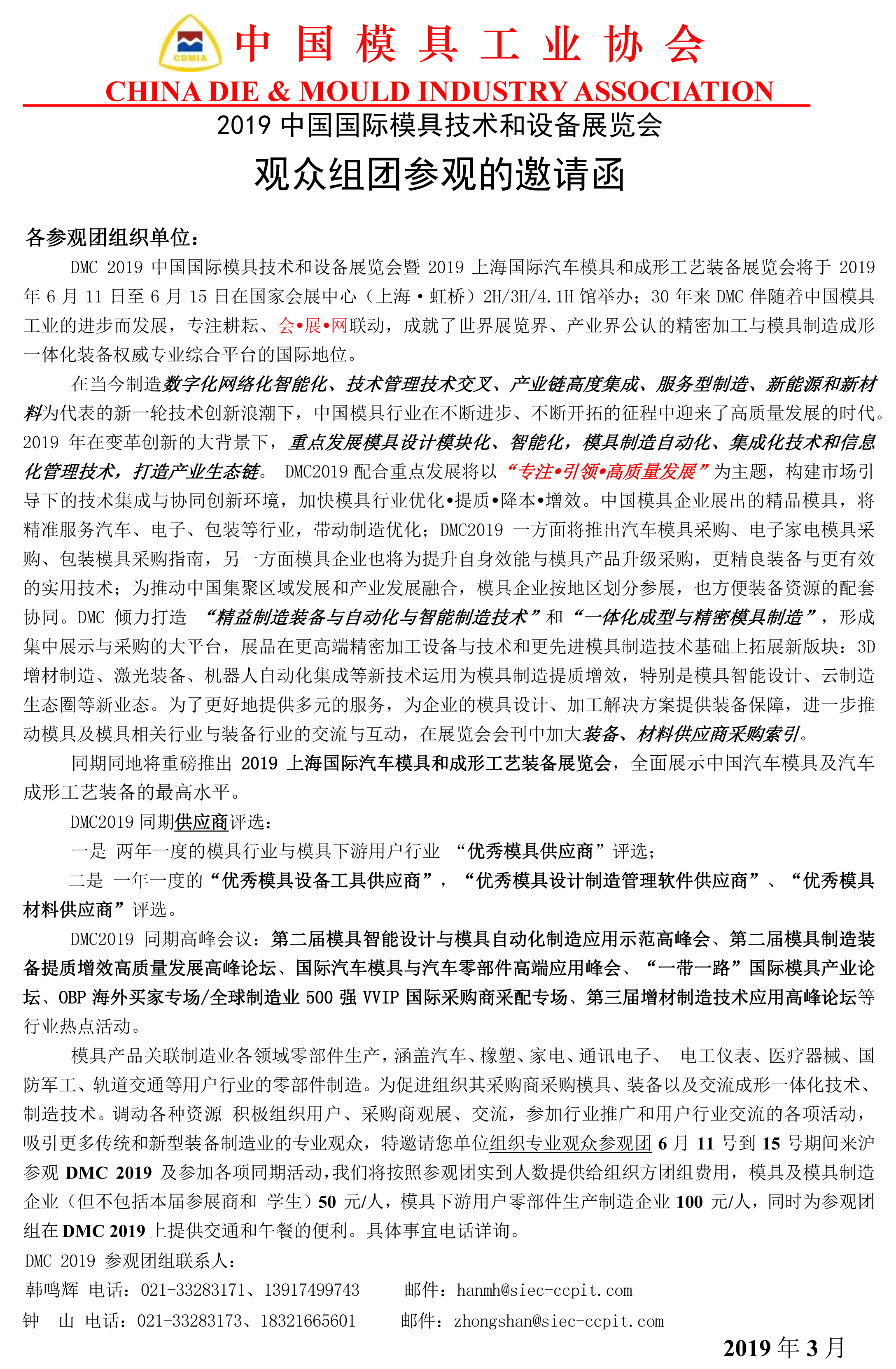 2019中國國際模具技術(shù)和設備展覽會(huì )觀(guān)眾組團參觀(guān)的邀請函