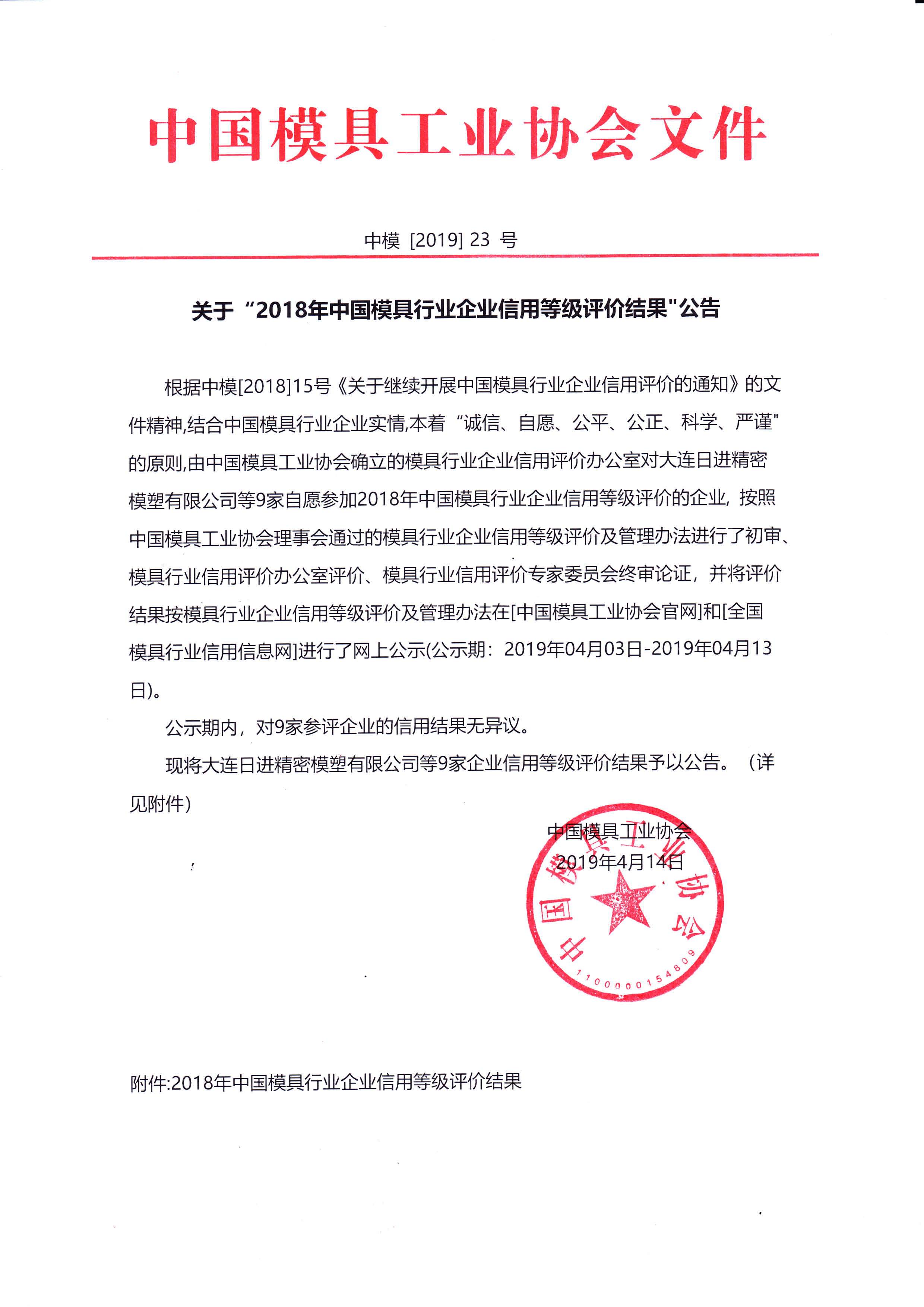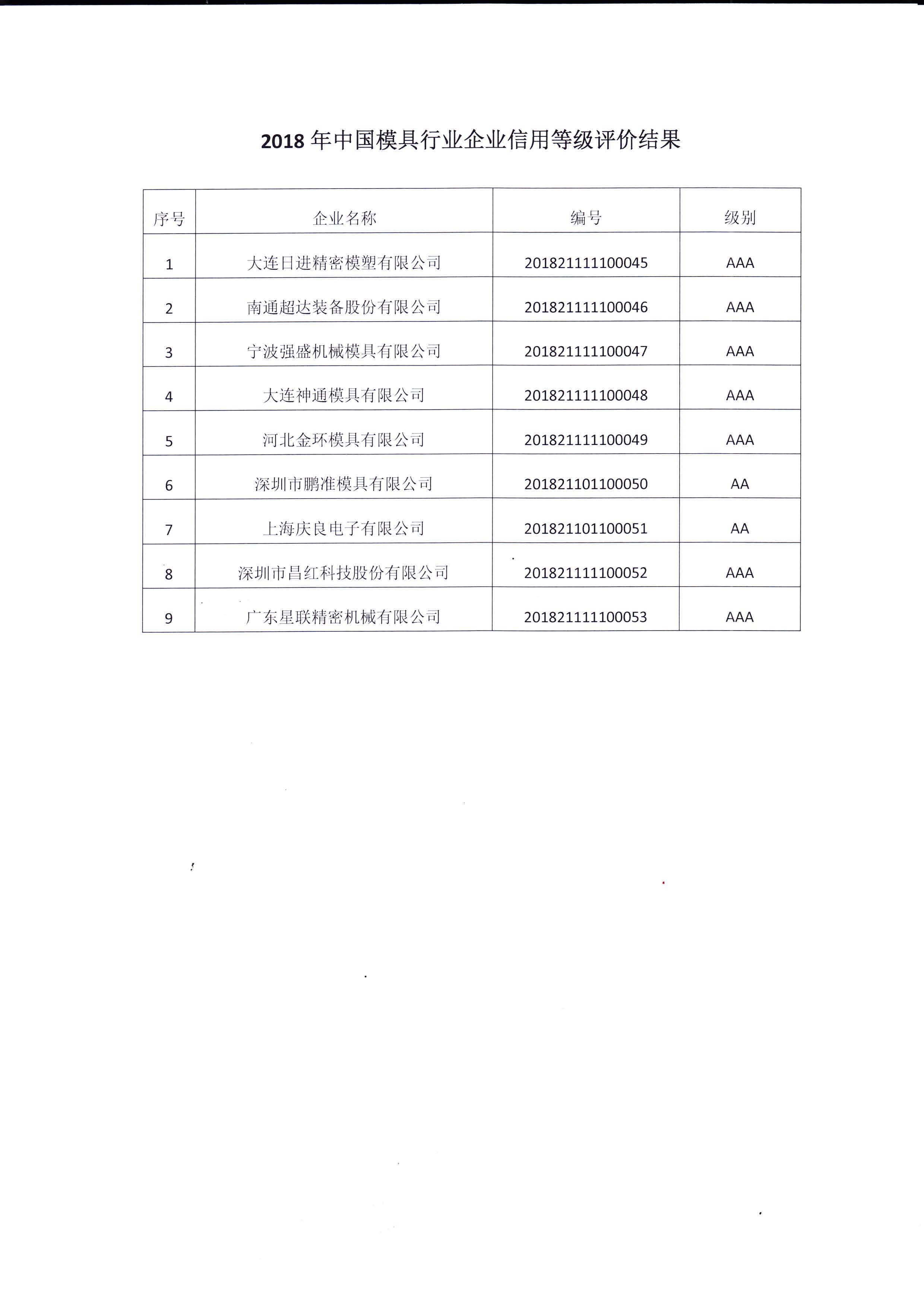 關(guān)于“2018年中國模具行業(yè)企業(yè)信用等級評價(jià)結果”公告