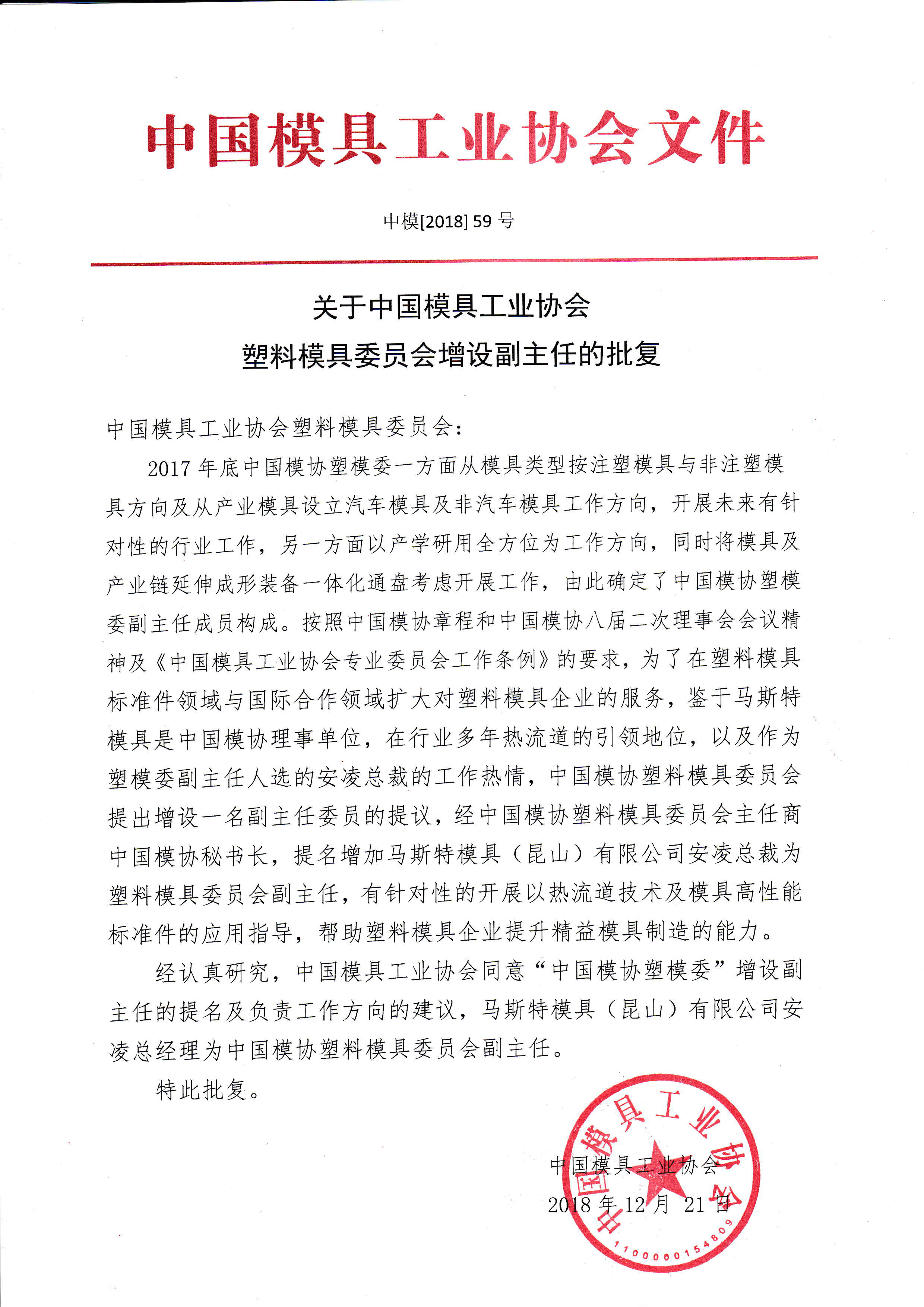 關(guān)于中國模具工業(yè)協(xié)會(huì )塑料模具委員會(huì )增設副主任的批復