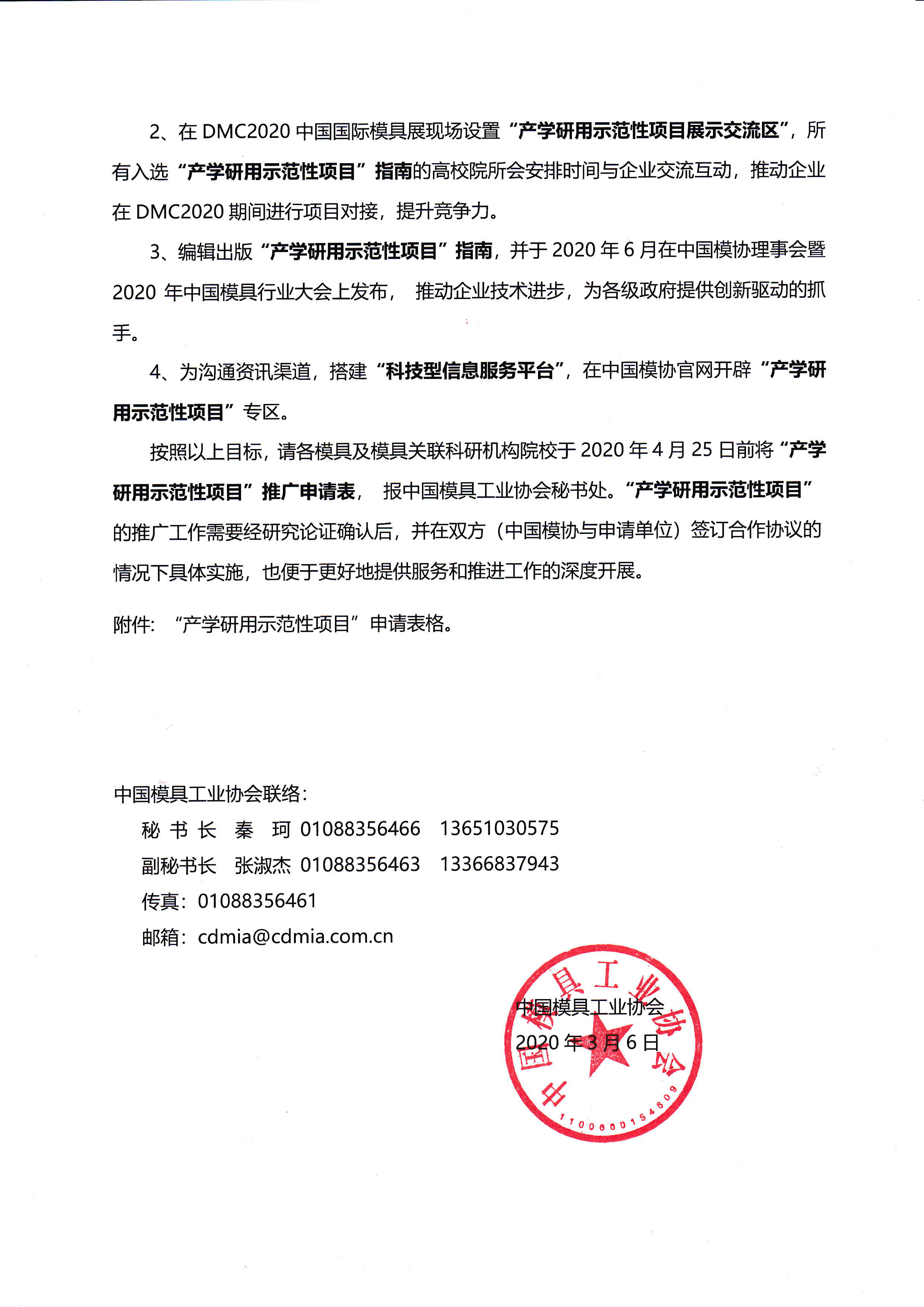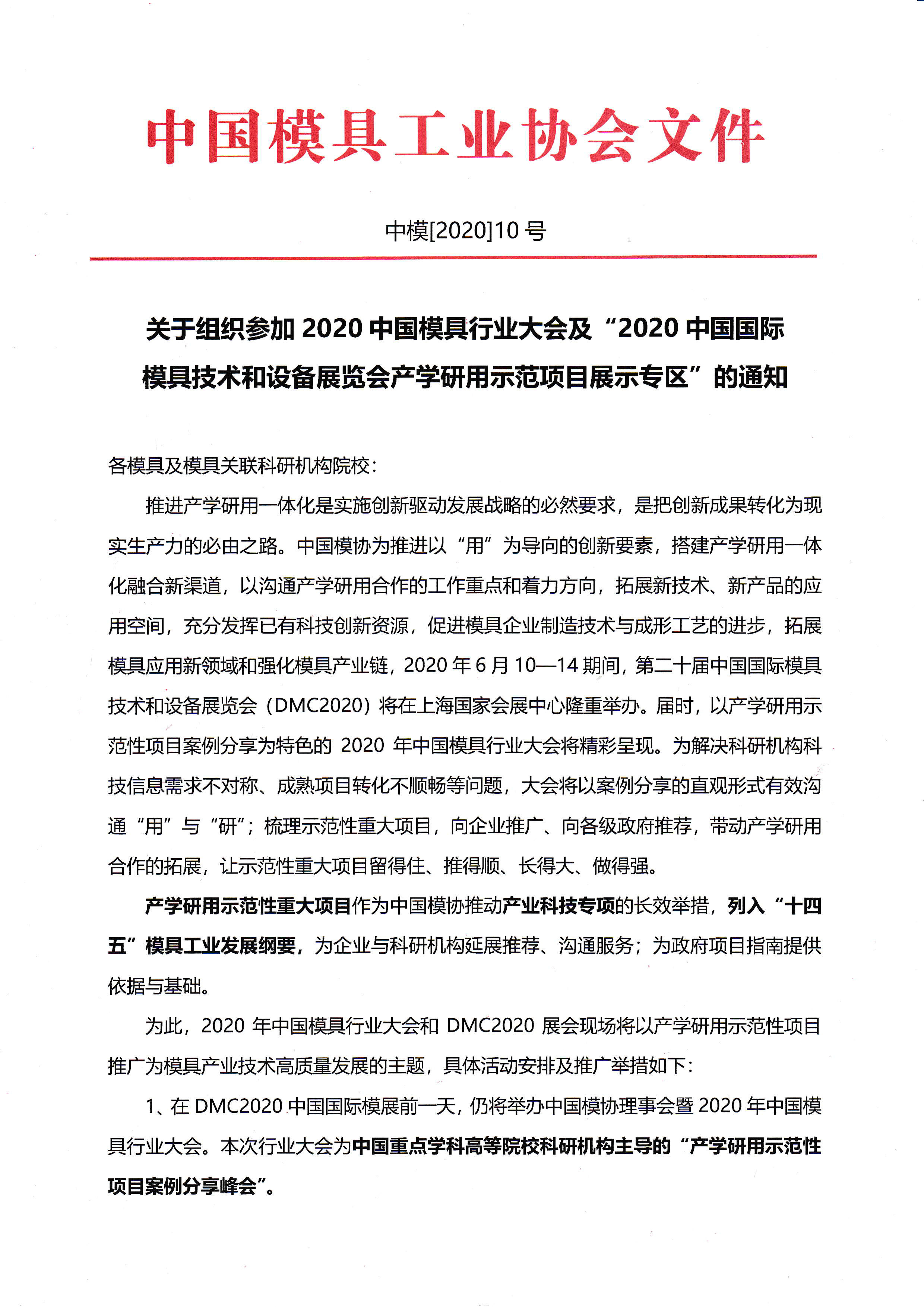 關(guān)于組織參加2020中國模具行業(yè)大會(huì )及“2020中國國際模具技術(shù)和設備展覽會(huì )產(chǎn)學(xué)研用示范項目展示專(zhuān)區”的通知