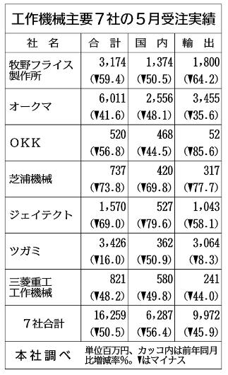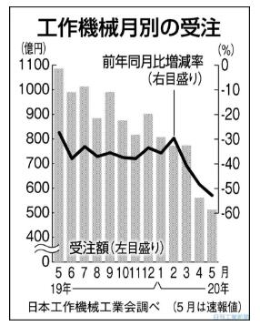 同一日,日本機床工業(yè)會(huì )(日工會(huì ))也公布了5月份的機床訂單實(shí)績(jì)(速報值)為512億6000萬(wàn)日元,與去年同期相比減少了52.8%,連續20個(gè)月低于去年同期。隨著(zhù)新型冠狀病毒疫情影響的擴大,客戶(hù)的設備投資紛紛擱置,營(yíng)業(yè)活動(dòng)也受到了自肅的影響,內需和外需都大幅下降??傤~與外需都是2009年11月以來(lái)的最低水平。單月的總額也連續2個(gè)月低于600億日元。