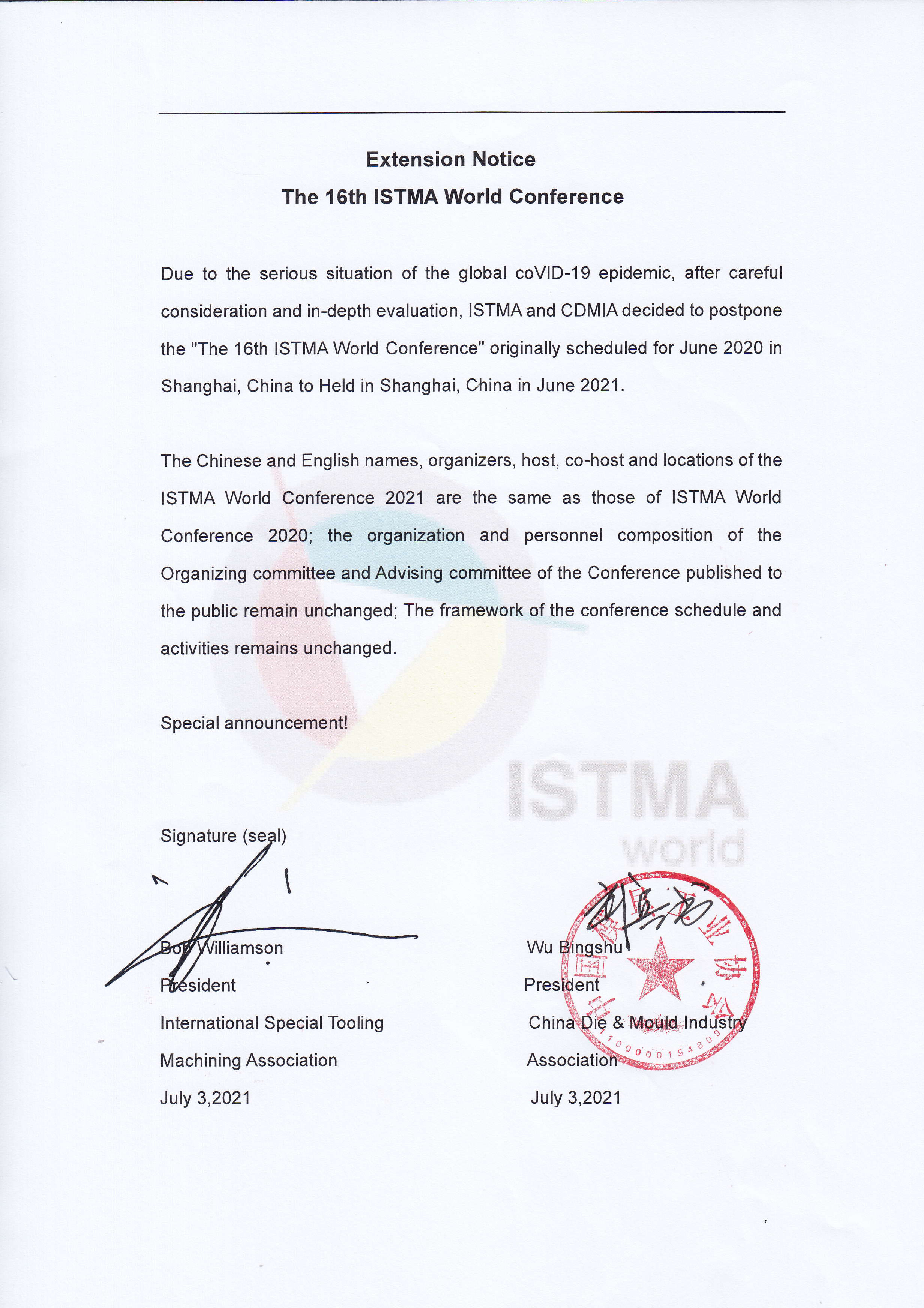 Extension Notice The 16th ISTMA World Conference