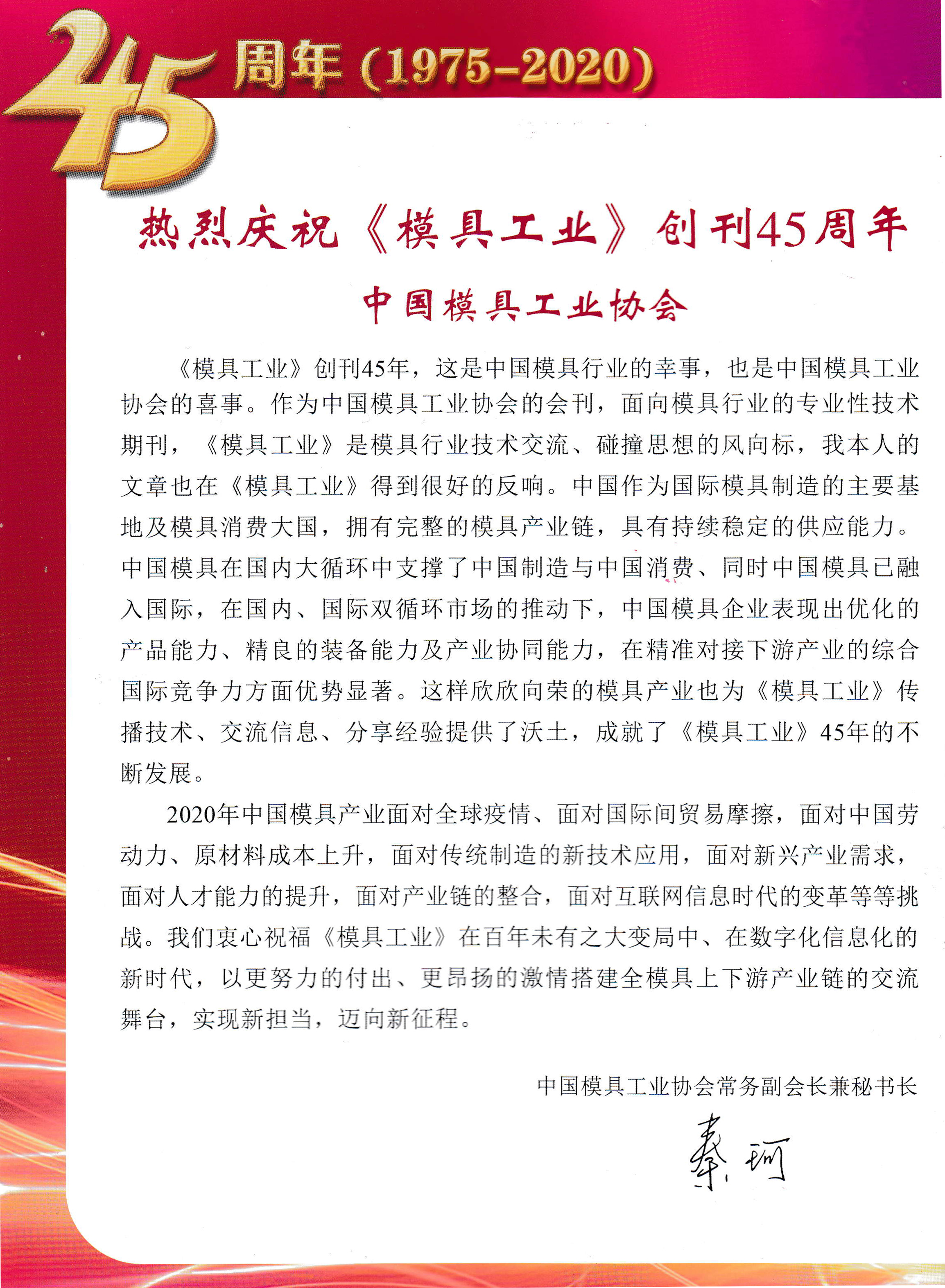 熱烈慶?!赌>吖I(yè)》創(chuàng )刊45周年——中國模協(xié)常務(wù)副會(huì )長(cháng)兼秘書(shū)長(cháng)秦珂寄語(yǔ)