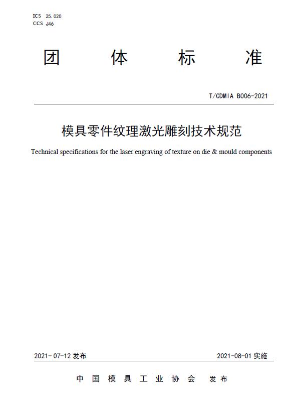 中國模協(xié)標準T/CDMIA B006-2021模具零件紋理激光雕刻技術(shù)規范