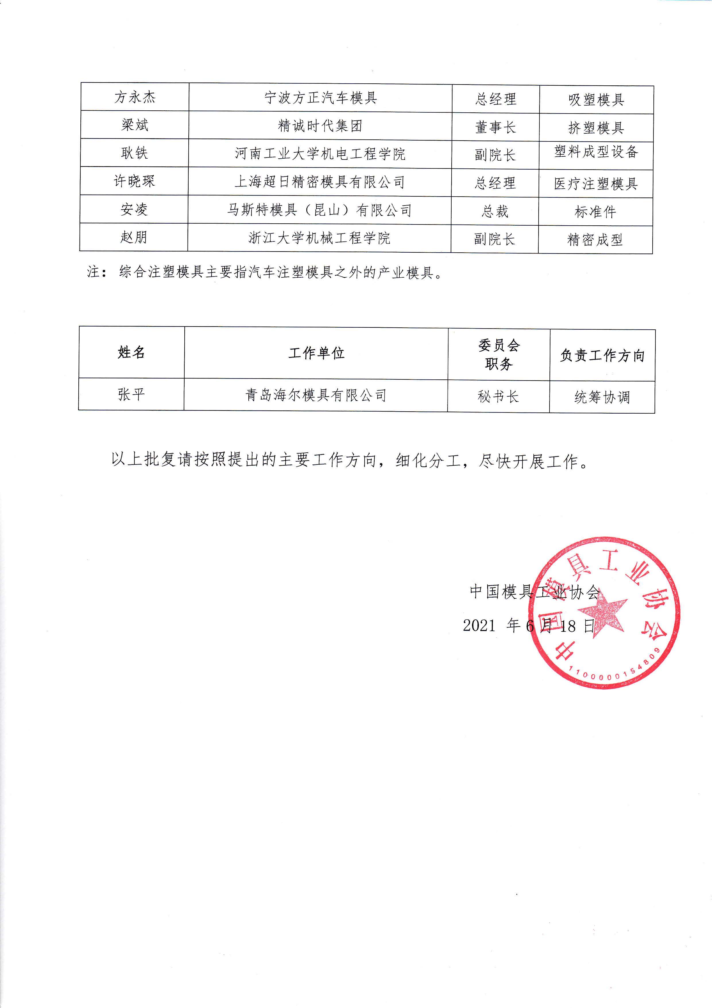 中國模協(xié)九屆理事會(huì )塑料模具委員會(huì )副主任組成及工作架構的批復