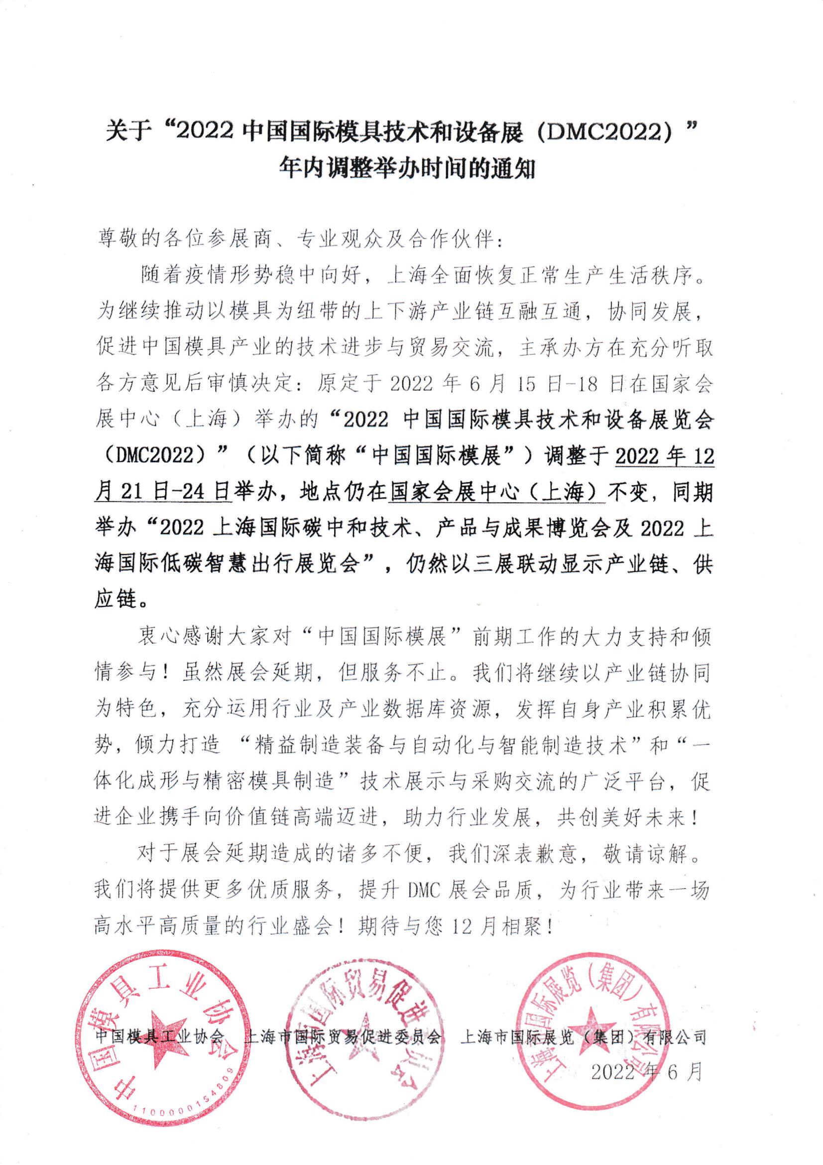 關(guān)于“2022中國國際模具技術(shù)和設備展(DMC2022)年內調整舉辦時(shí)間的通知”