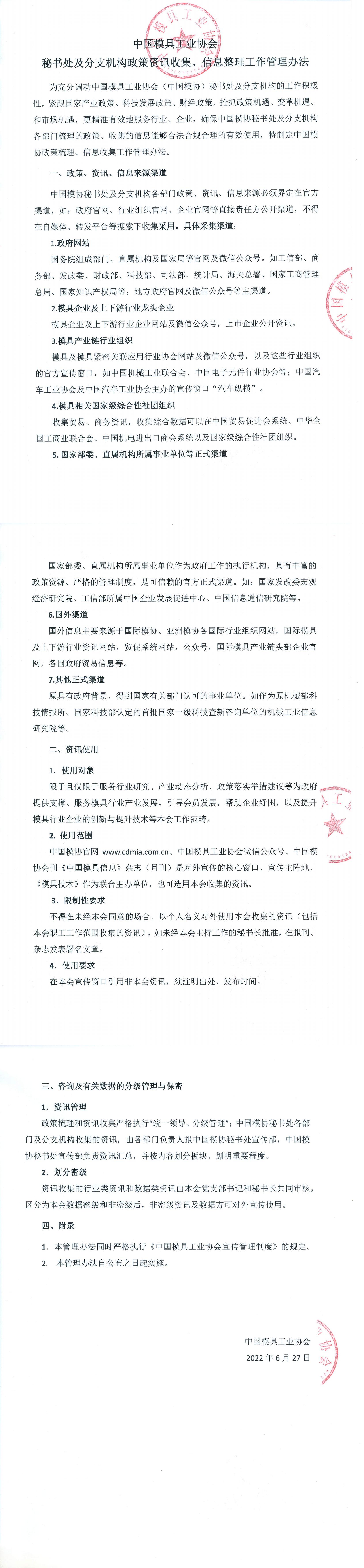 中國模具工業(yè)協(xié)會(huì )秘書(shū)處及分支機構政策資訊收集、信息整理工作管理辦法