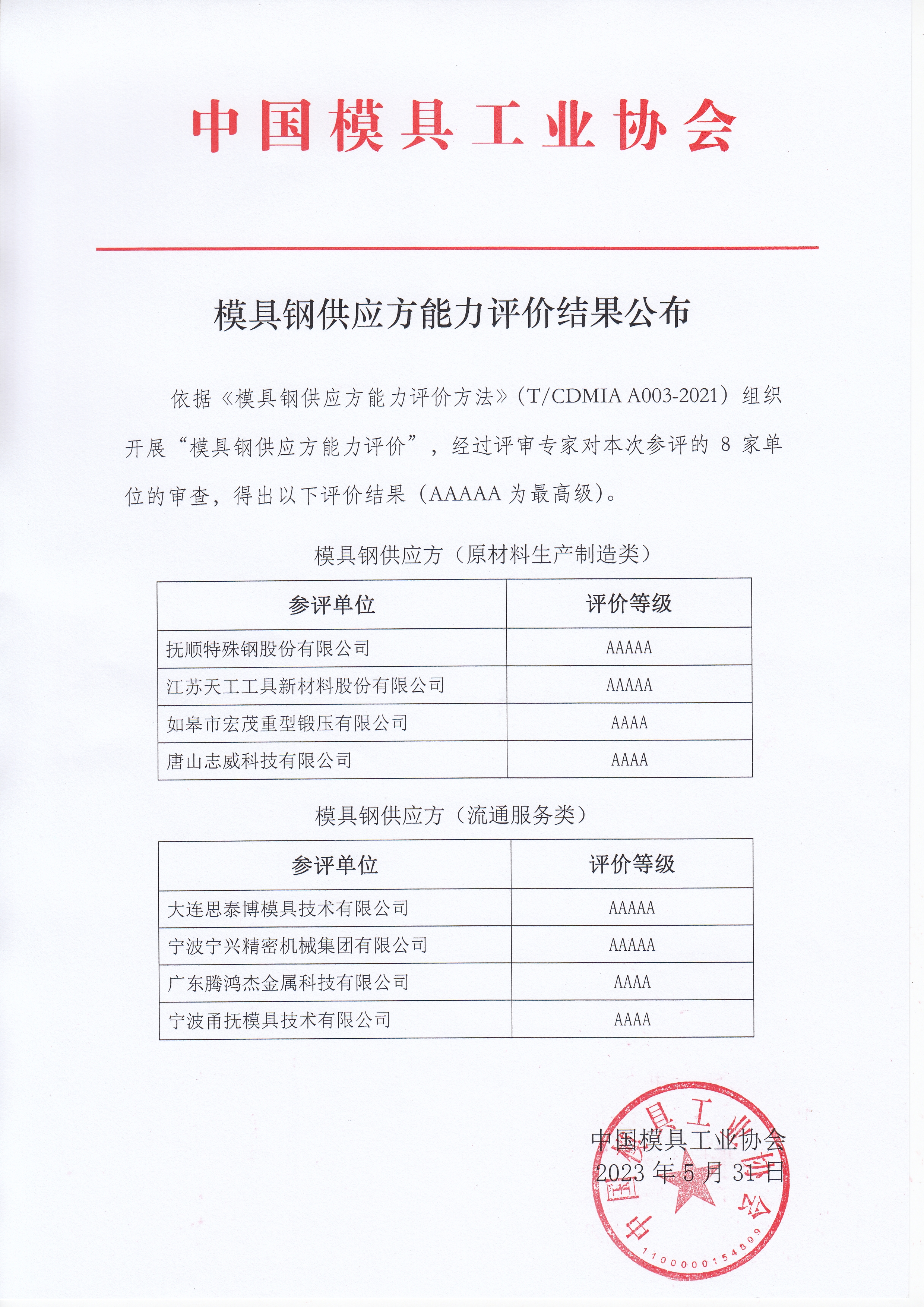 模具鋼供應方能力評價(jià)結果公布