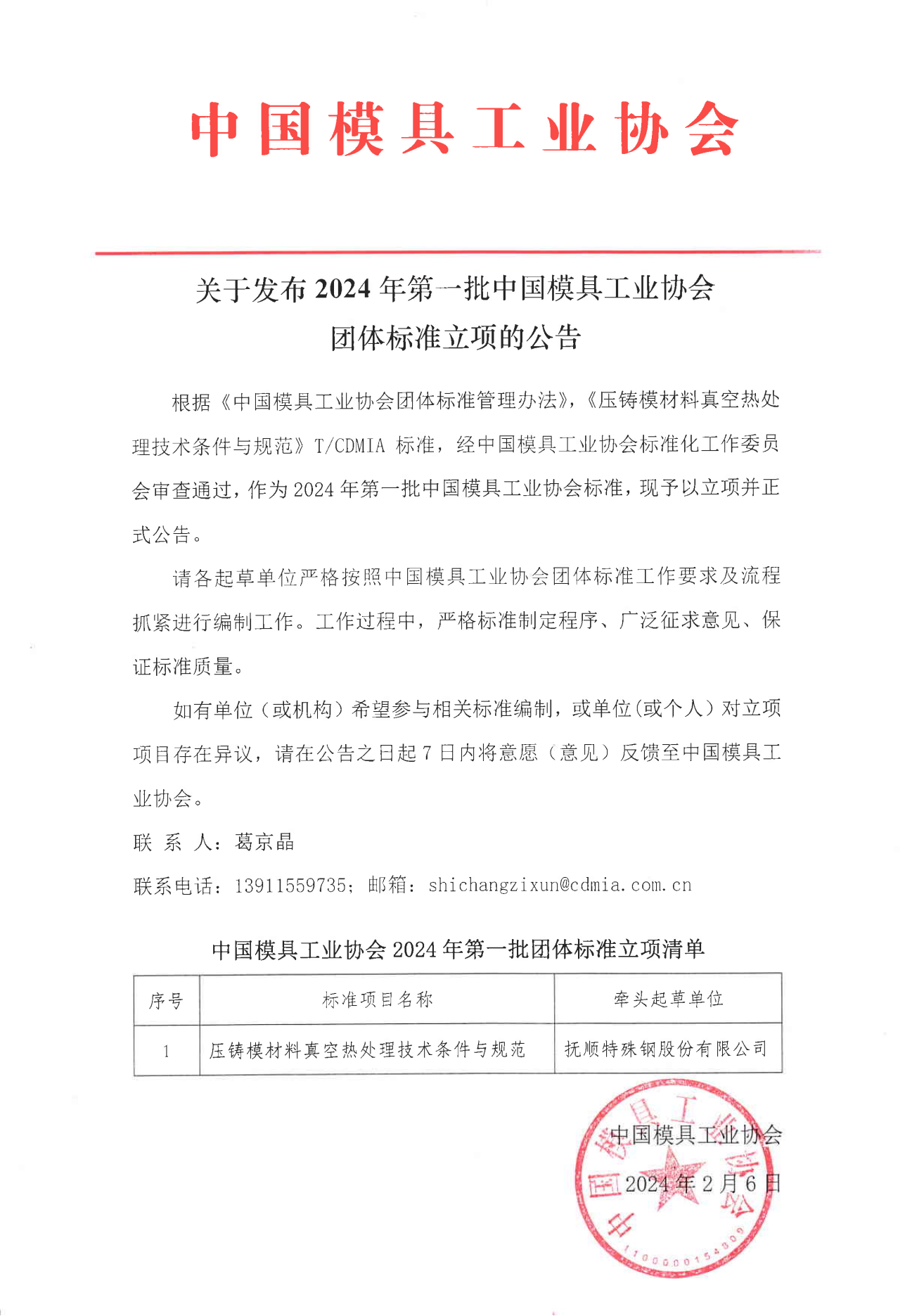 關(guān)于發(fā)布2024年第一批中國模具工業(yè)協(xié)會(huì )團體標準立項的公告