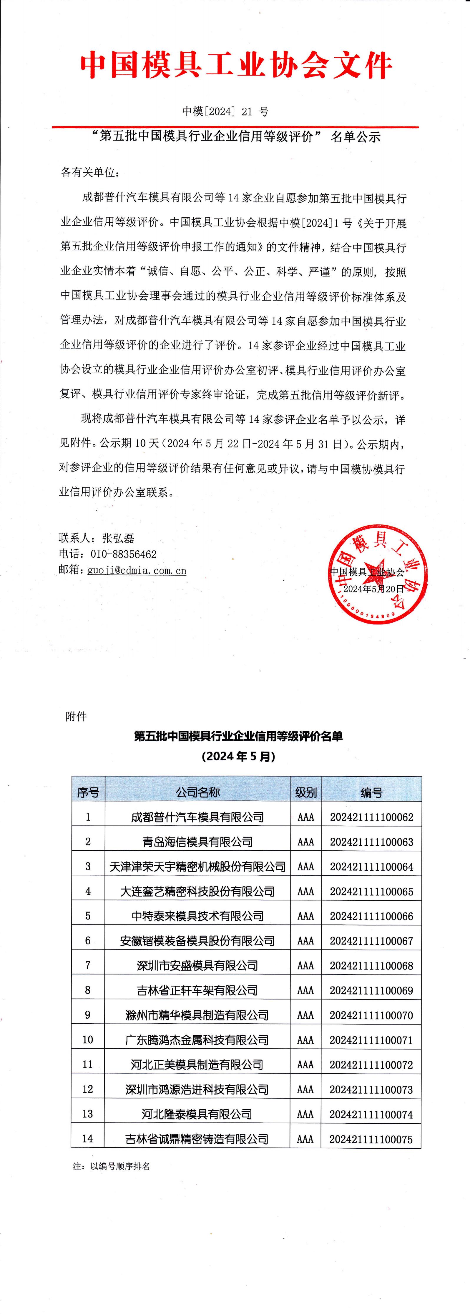 “第五批中國模具行業(yè)企業(yè)信用等級評價(jià)”名單公示
