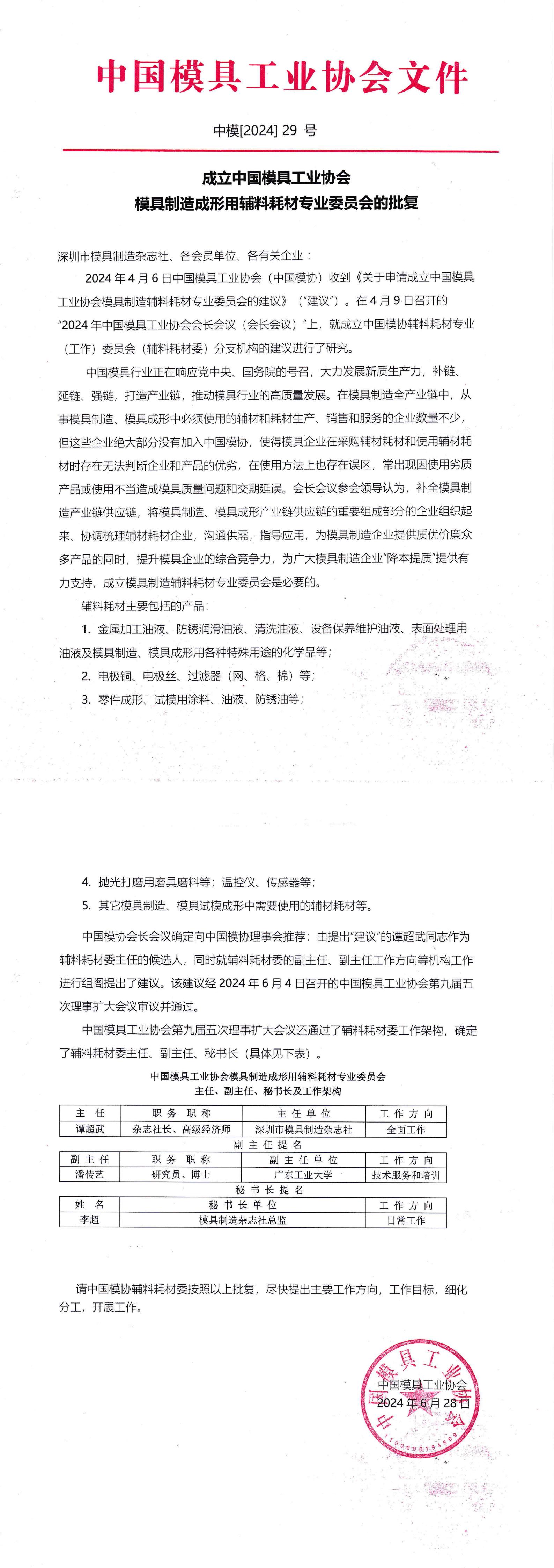 成立中國模具工業(yè)協(xié)會(huì )模具制造成形用輔料耗材專(zhuān)業(yè)委員會(huì )的批復